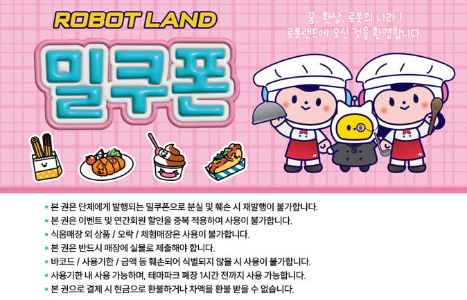 - 밀쿠폰 앞면에 날인된 당일 또는 사용기한 내에 사용 가능하며, 사용시간은 테마파크 폐장 1시간 전까지 사용 가능합니다.